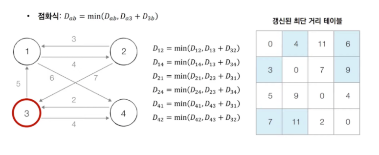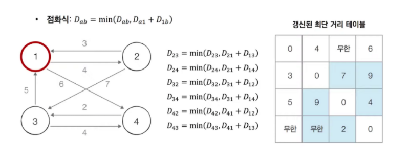 [Step 4] 3번 노드를 거쳐 가는 경우를 고려하여 테이블을 갱신한다.