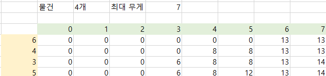 예제에 따라 입력을 나누어보았다. 열은 무게 K, 행은 물건의 Value이다.