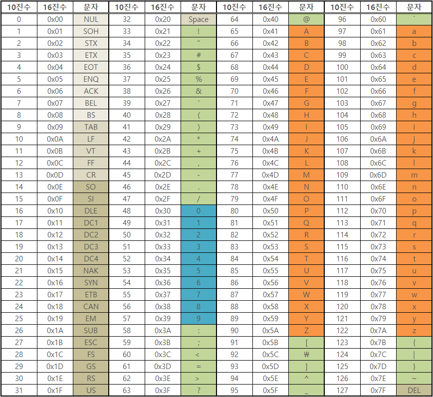 아래 ASCII 코드 표를 보면 0은 48이기 때문에 48을 빼주면 된다.