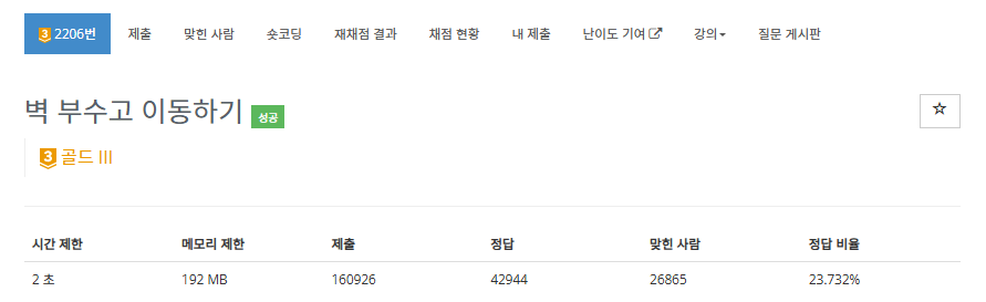 만약에 이동하는 도중에 한 개의 벽을 부수고 이동하는 것이 좀 더 경로가 짧아진다면, 벽을 한 개 까지 부수고 이동하여도 된다.