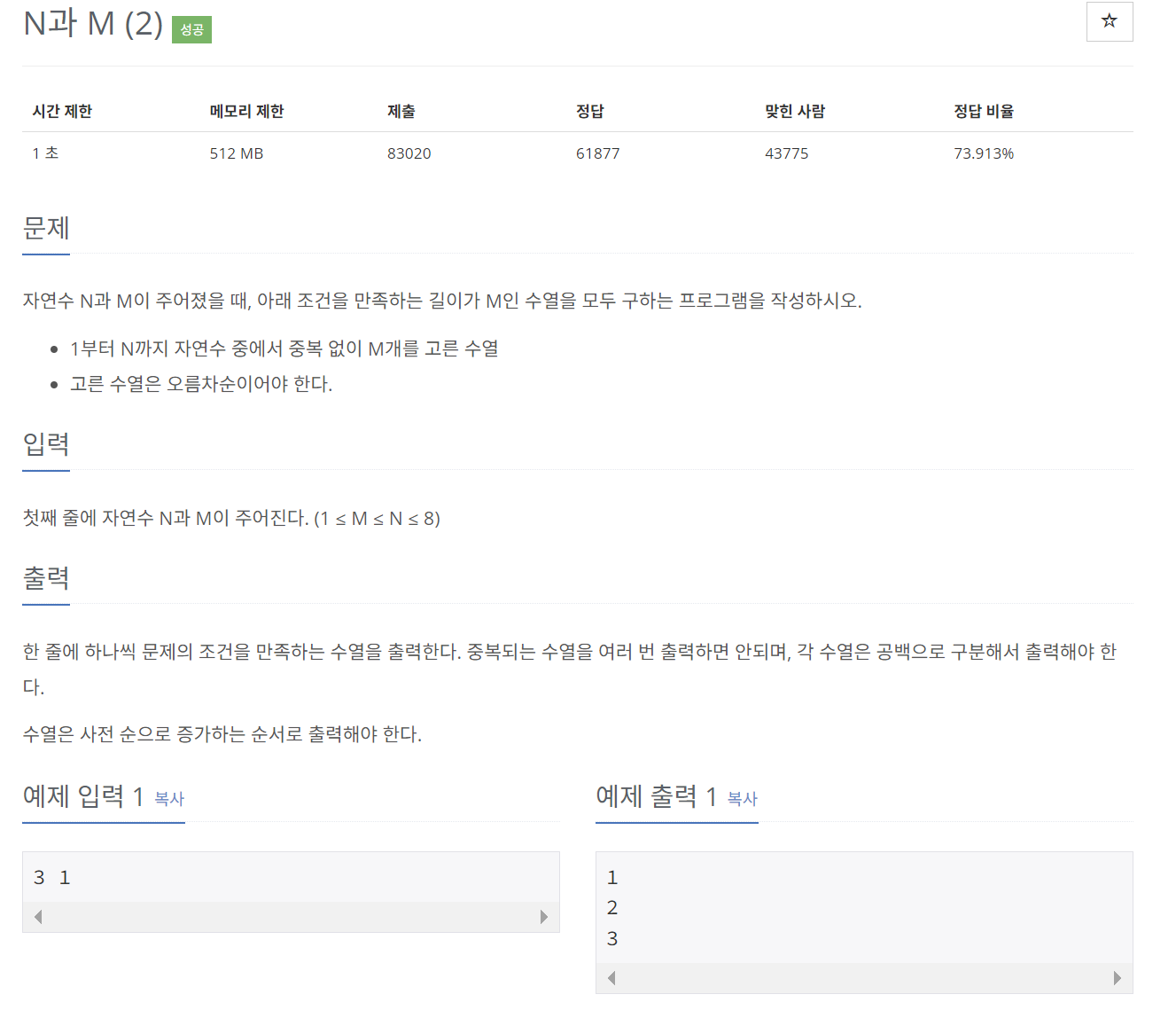 조건 1을 따져보면 n개와 m개를 입력받고 재귀함수 안에서 m개의 조건을 충족하면 출력한다.