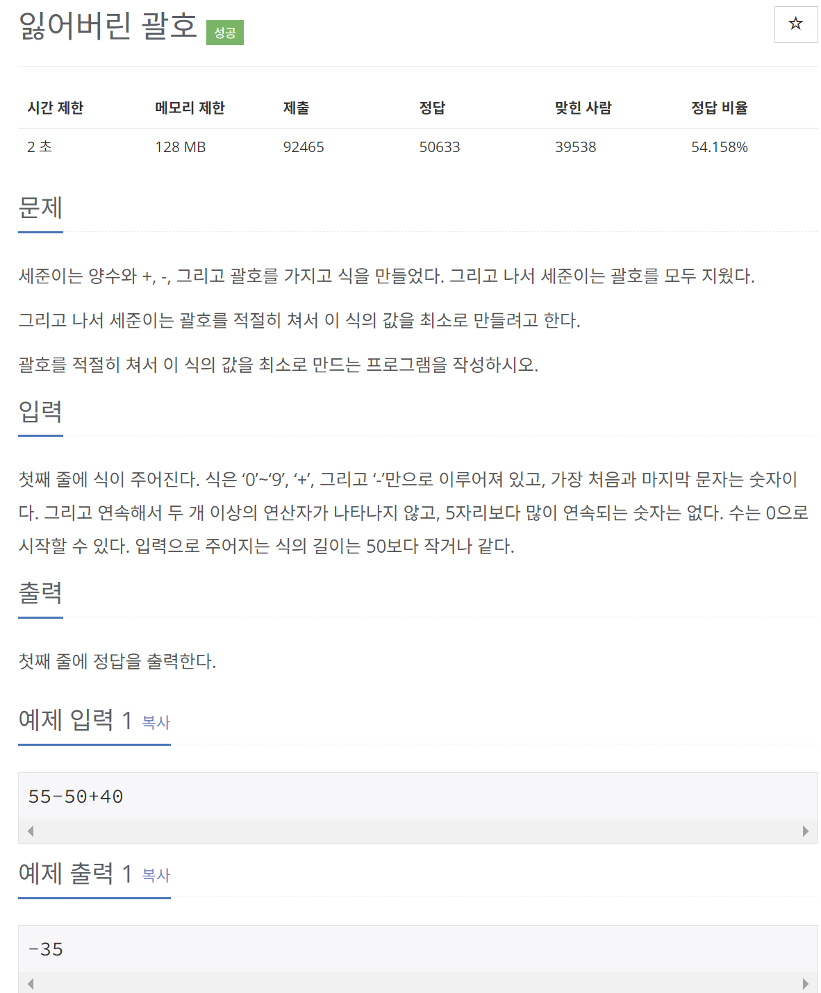 [백준/C++] 잃어버린 괄호 풀이 1541번 /그리디/알고리즘/코딩테스트 - (1) 본문