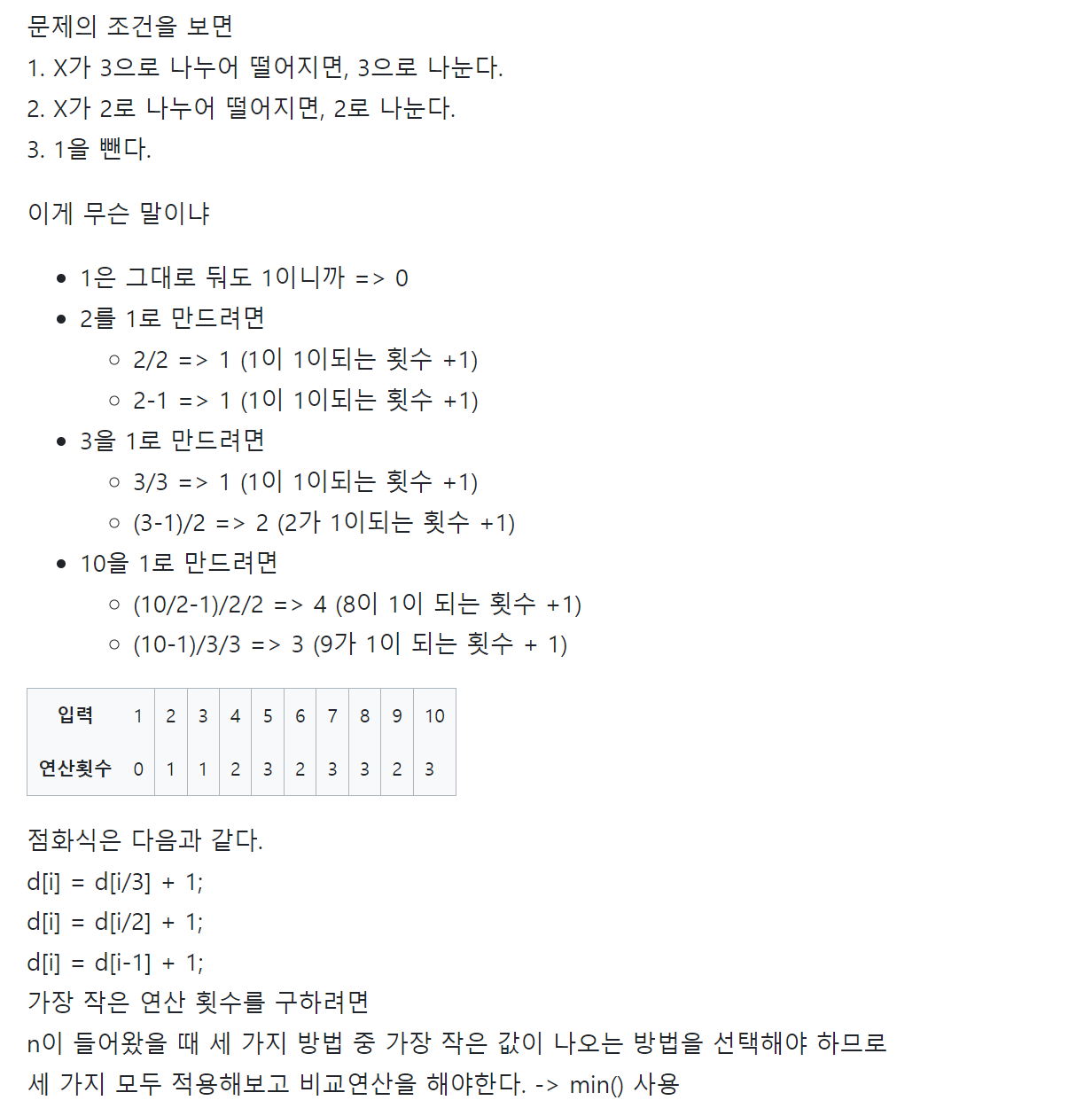 이 부분의 경우 if문이 연달아 2개이기 때문에 조건이 성립되면 결국에 min(dp[i-1]+1, dp[i/2]+1, dp[i/3]+1)을 비교한 것이다!!