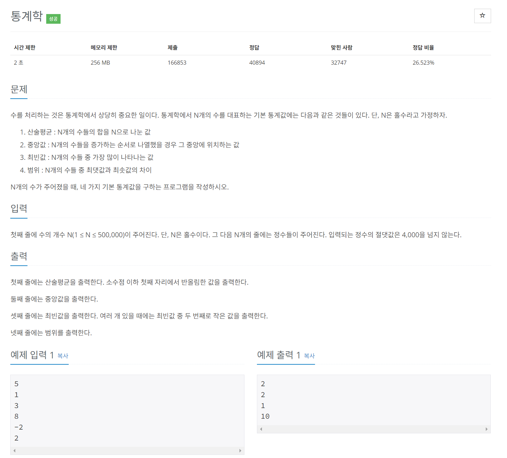 [백준/C++] 2108번 통계학 본문