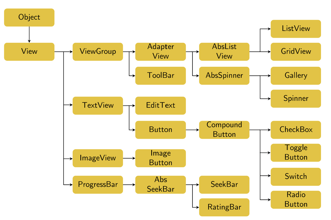 View class는 이런식으로 세분화 됩니다. 화면에 보이는 요소를 View라고 하고 그 요소들을 배치하는 레이아웃을 ViewGroup이라고 생각하면 됩니다. 그 외에 TextView, ImageView, ProgressBar 등이 존재합니다.