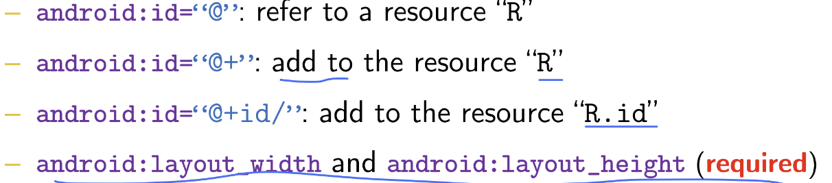 android:id 속성을 사용할 때는 @+id/와 식별자를 함께 사용하며, 이것이 뷰의 고유한 ID로 사용됩니다. 여기서 + 기호는 새로운 ID를 생성하겠다는 의미이며, id/는 이 ID가 리소스로 사용되는 것을 나타냅니다.