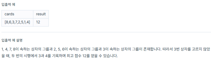 상자 안에 들어있는 카드 번호가 순서대로 담긴 배열 cards가 매개변수로 주어질 때, 범희가 이 게임에서 얻을 수 있는 최고 점수를 구해서 return 하도록 solution 함수를 완성해주세요.