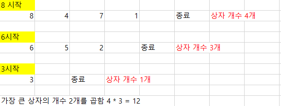 이런 식의 시퀀스 진행이 된다. 따라서, check 안한 지점을 기준으로 시작해서 상자 몇 개가 나오는지 구하고, 마지막에 각 그룹별 상자의 개수 Top 2를 곱해주면 끝이다.