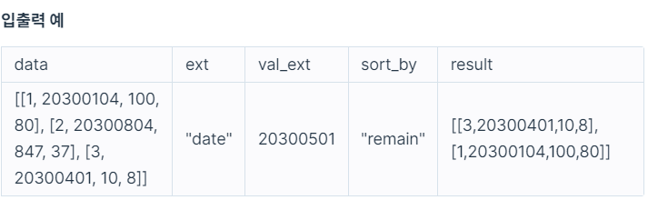 data에서 ext 값이 val_ext보다 작은 데이터만 뽑은 후, sort_by에 해당하는 값을 기준으로 오름차순으로 정렬하여 return 하도록 solution 함수를 완성해 주세요. 단, 조건을 만족하는 데이터는 항상 한 개 이상 존재합니다.