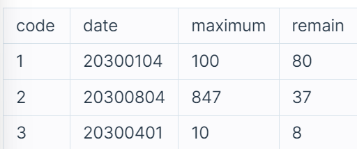 - 순서대로 코드 번호, 제조일, 최대 수량, 현재 수량을 의미합니다.