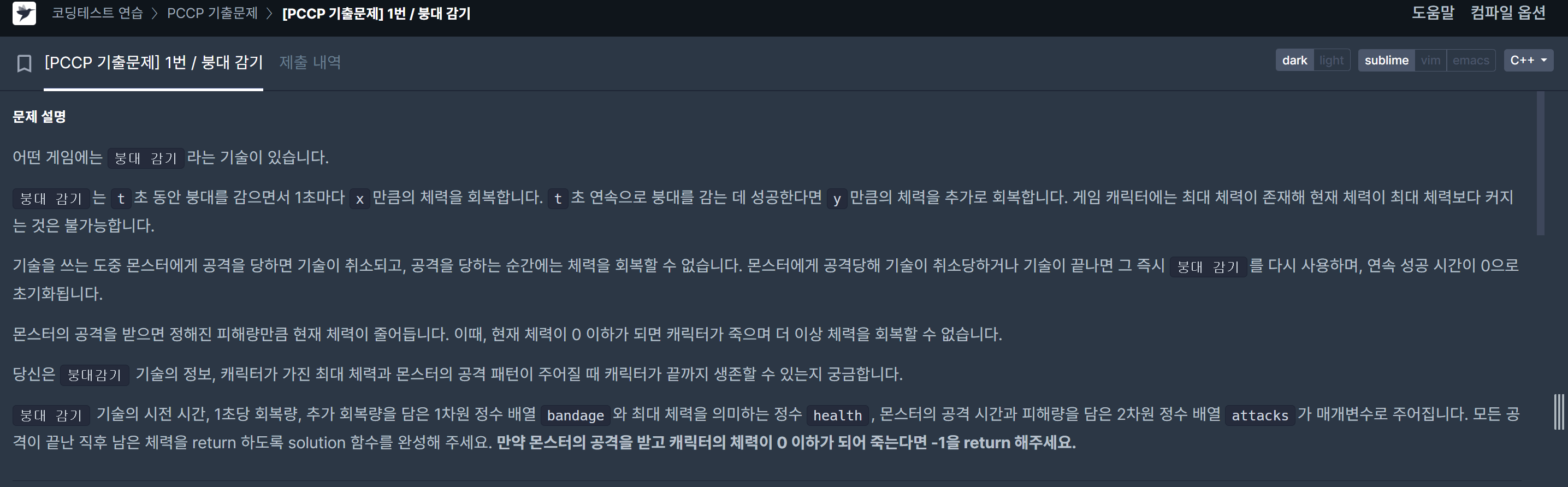 [프로그래머스/C++] PCCP 기출문제 1번 / 붕대 감기 본문