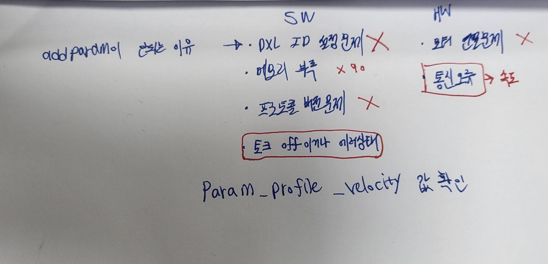 이 중 문제를 해결하는 과정에서 2번 통신 오류가 주요 원인임을 확인했다. 현재 다이나믹셀에 명령을 약 40msec 간격(0.04초)으로 전달하고 있었는데, 이 짧은 명령 전송 주기가 원인이었다. 초기 설정에서는 40msec 간격으로도 안정적으로 명령을 전달할 수 있었으나, 이번 오류를 계기로 간격이 짧아질수록 다이나믹셀의 명령 처리에 과부하가 발생할 수 있음을 알게 되었다.