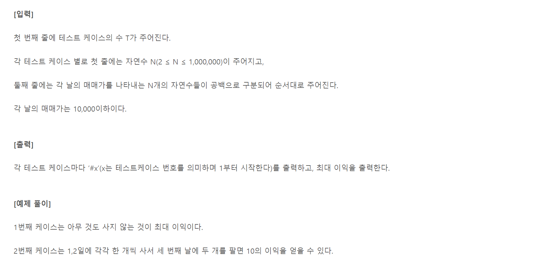SWEA 1859 백만 장자 프로젝트 입/ 출력 및 예제 풀이